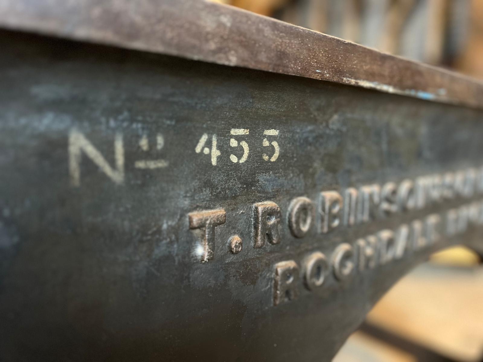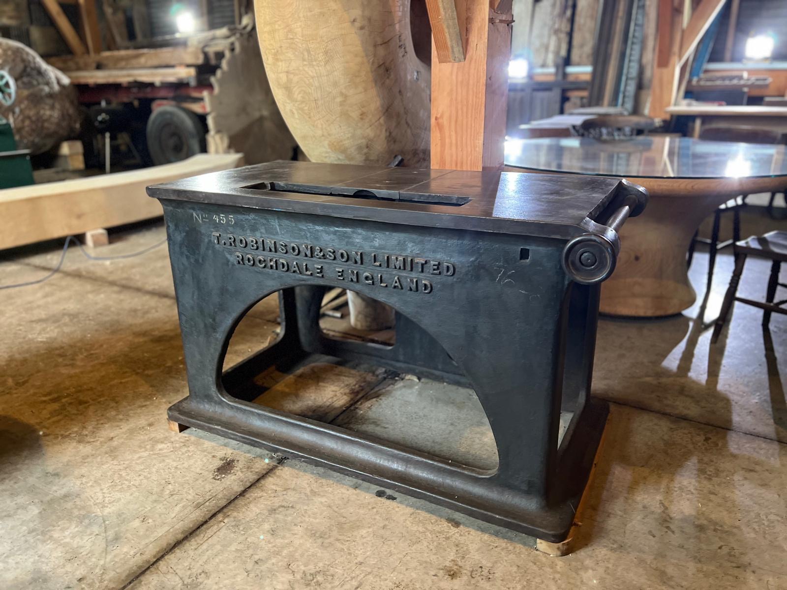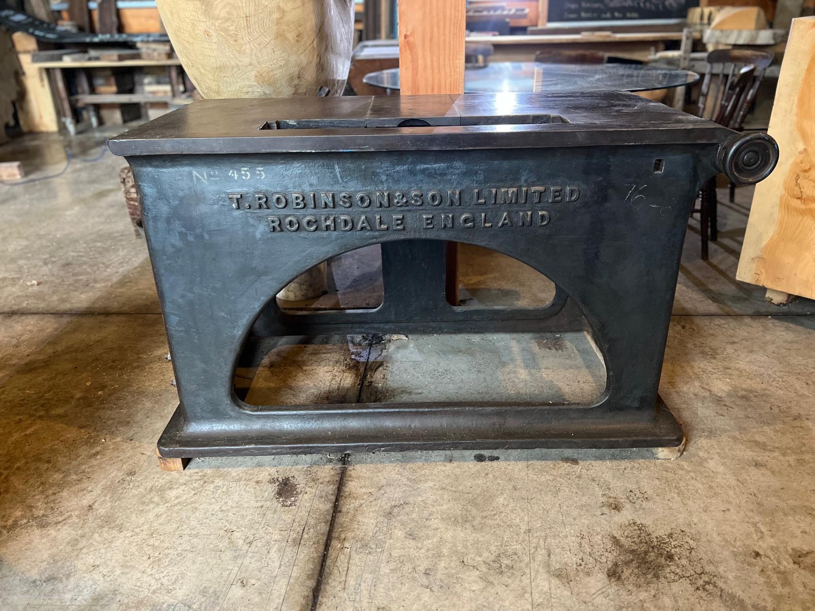 This original T Robinson & Son Limited saw table, made in Rochdale, England, is a rare piece of British industrial heritage. Marked “No. 455”, the table retains its authentic character from its original use as a cutting saw table.